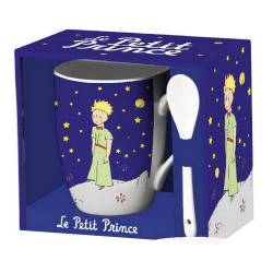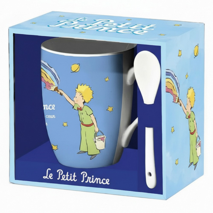 Tasse et cuillère en porcelaine de la marque Enesco de qualité Le Petit Prince: peignant un arc-en-ciel. D'après les dessins originaux d'Antoine de Saint-Exupery. Produit sous licence officielle du Petit Prince. Hauteur: 7cm