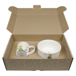 Ensemble de tasse, bol et assiette avec boîte cadeaut en porcelaine de qualité de la marque allemande Könitz Le Petit Prince avec la Rose. Idéal pour un cadeau, compatible avec micro-ondes et lave-vaisselle. Le petit-déjeuner sera beaucoup plus amusant si vous êtes un fan des légendaires BD Le Petit Prince.