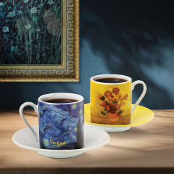 Ensemble de 2 tasses en porcelaine avec 2 soucoupes de marque Enesco de qualité dans un coffret cadeau Van Gogh. Idéal pour un cadeau, compatible avec micro-ondes et lave-vaisselle. Pour boire un café en famille ou entre amis. Hauteur de chaque tasse: 5cm.