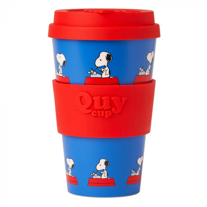 Mug à café à emporter Peanuts, Snoopy: Machine à écrire. Fabriqué en RPET (Pet recyclé) pour usage alimentaire. Couvercle anti-goutte breveté QuyCup, bande en silicone souple anti-brûlure. Parfait pour les boissons chaudes et froides. Ne dégage aucune odeur ni saveur (Sans BPA). Résistance thermique +120° -20°. Idéal pour un cadeau, compatible avec micro-ondes et lave-vaisselle. 400ml.