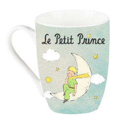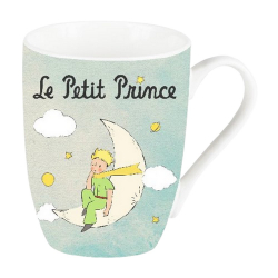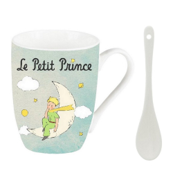 Tasse et cuillère en porcelaine de la marque Enesco de qualité Le Petit Prince: assis sur la lune D'après les dessins originaux d'Antoine de Saint-Exupery. Produit sous licence officielle du Petit Prince. Hauteur: 7cm