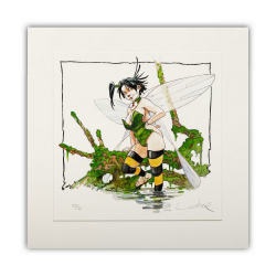 Reproduction fidèle d'une case BD sur toile imprimée issue de la série Gaston Lagaffe. Les Editions du Grand Vingtième, dimensions: 60x35cm. Cadre en bois de Ardennes. Encore une invention de Gaston, cette fois-ci un fauteuil révolutionnaire !