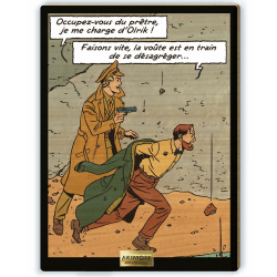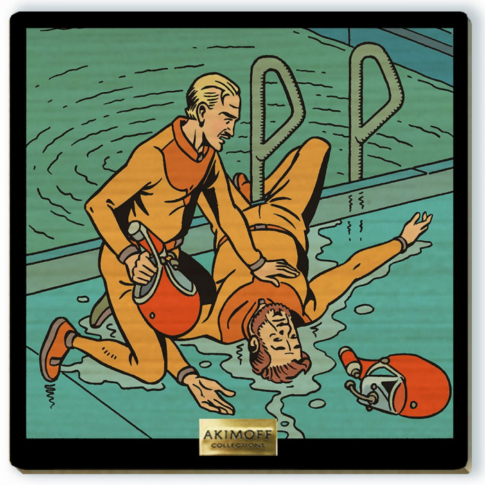 Tableau en bois d'érable collection du fabricant Akimoff: Sauver Mortimer. Une aventure où la science rattrape brusquement la fiction. Blake tire Mortimer d’un très mauvais pas: l’urgence pure. Tableau extrait de scènes fortes de l’album: La Menace atlante. Fidèlement reproduits à partir des planches originales. Edition limitée. Tirage: 59 exemplaires numérotés de 1 à 59.