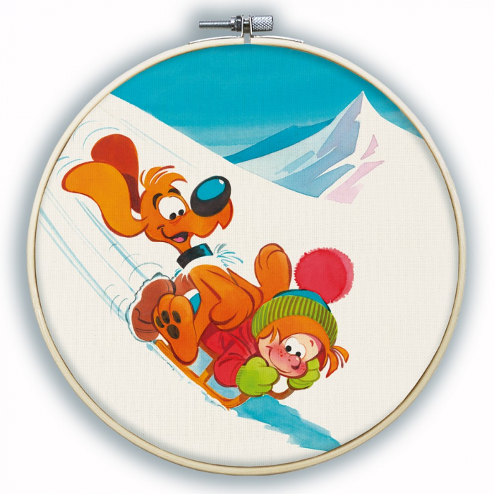 Un canevas illustré monté en cerceau bambou d'après l'œuvre de Jean Roba. Les aventures familiales de Boule, âgé de 7 ans et de Bill, son chien plus que fidèle !