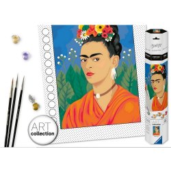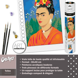 Coffret toile de peinture par numéros CreArt Ravensburger: Frida Kahlo. Tout le monde peut être un artiste avec la peinture par numéros ! Peignez pas à pas grâce aux champs de peinture numérotés et réalisez un véritable chef-d'œuvre. Vous serez fiers de dévoiler votre réalisation ! 30x40cm.