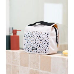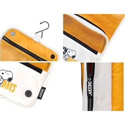 Trousse de toilette de voyage suspendue Erik Peanuts, Snoopy: Lazy Days. Elle présente un motif imprimé et dispose d'une poignée, d'une poche arrière, d'une fermeture à pression, d'un crochet pour la suspendre, de deux poches intérieures et de trois compartiments à fermeture éclair de différentes capacités. Dimensions fermé: 25x9,5x20cm. Dimensions ouvert: 25x9,5x43cm.